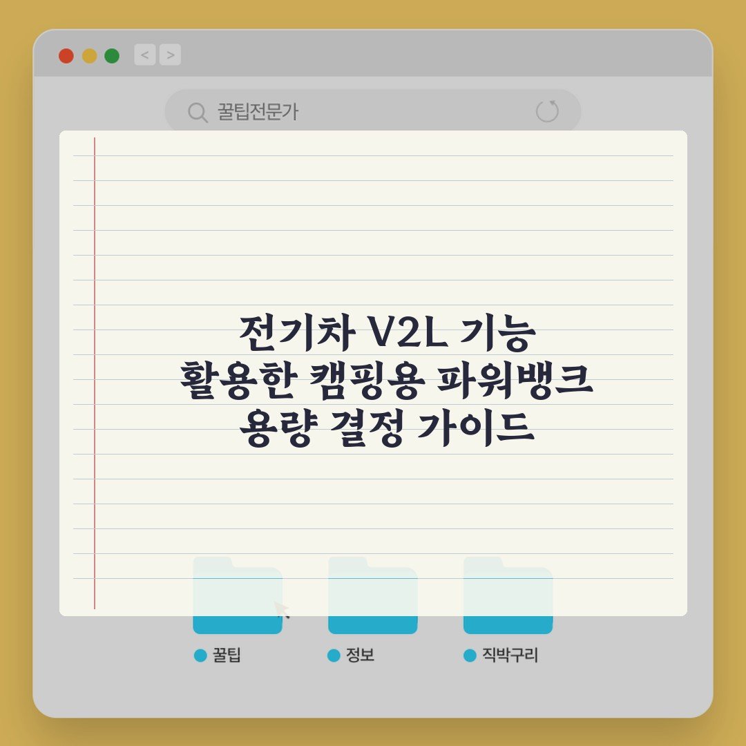 전기차 V2L 기능 활용한 캠핑용 파워뱅크 용량 결정 가이드 2026년 03월 10일 작성자: 인팁 전기차의 V2L 기능을 활용하여 캠핑용 파워뱅크 용량을 결정하는 가이드를 제공합니다. 스마트한 캠핑을 위한 필수 정보!