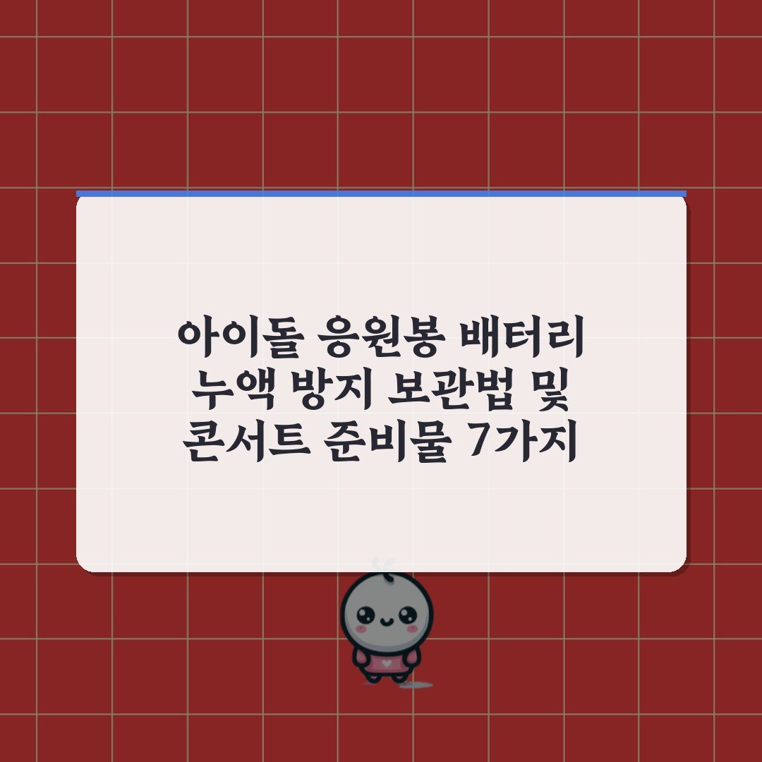 아이돌 응원봉 배터리 누액 방지 보관법 및 콘서트 준비물 7가지 가이드 2026년 03월 09일 작성자: 인팁 아이돌 응원봉 배터리 누액 방지 보관법과 콘서트 준비물 7가지를 알아보세요. 안전하고 즐거운 콘서트를 위한 필수 가이드!
